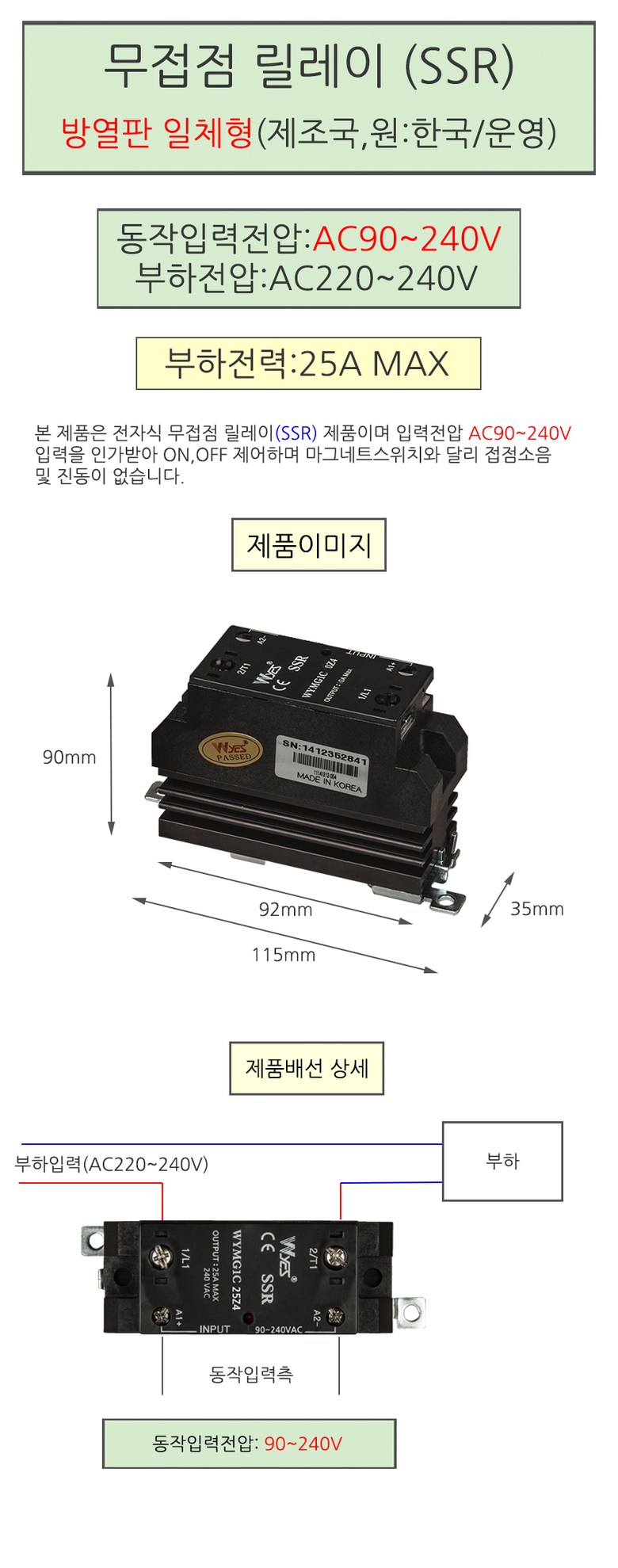 동작입력전압: AC90~240V / 부하전압: AC220~240V / 부하전력: 25A MAX