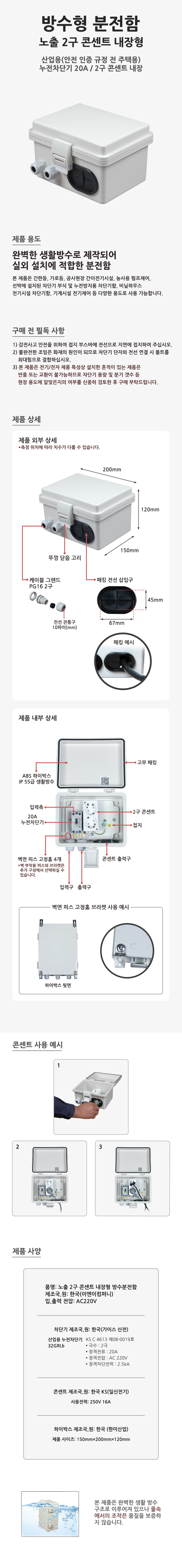 메인 차단기: ELB 20A / 노출 콘센트 2구: 250V 16A / 가로 200mm*세로 150mm*높이 120mm
