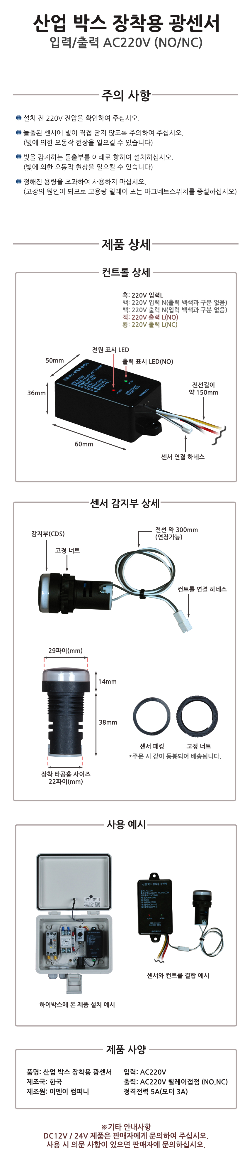 입출력: AC220V (NO/NC) / 정격전력: 5A(모터 3A)