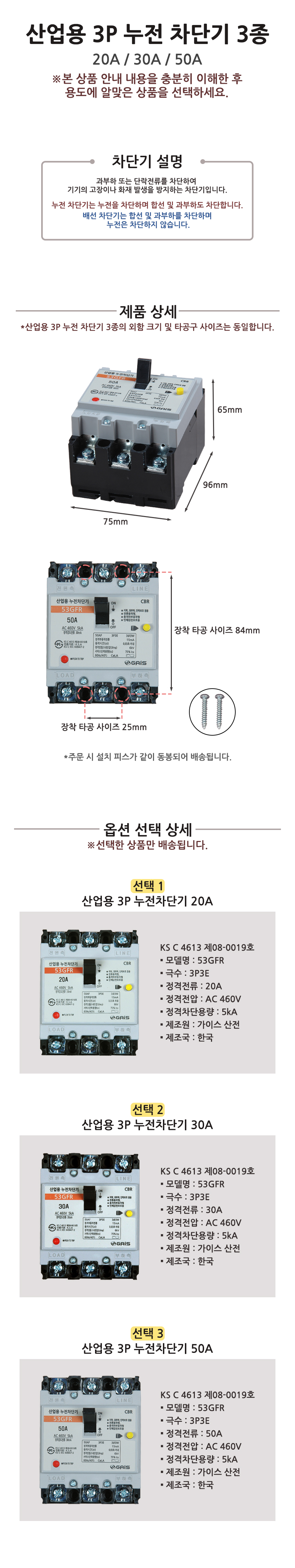 산업용 3P 누전차단기 3종