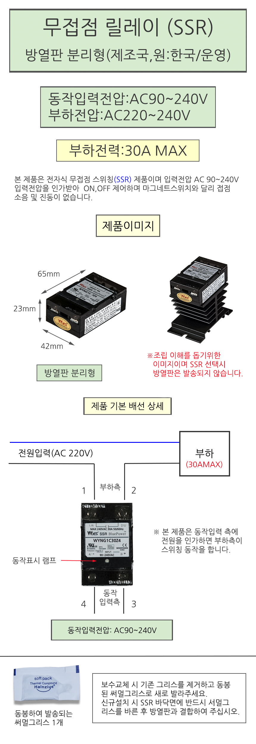 동작입력전압: AC90~240V / 부하전압: AC220~240V / 부하전력: 30A MAX